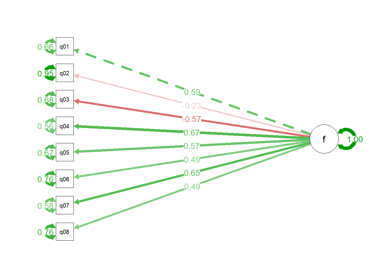 # plot the results# for one standard deviation increased in factor number 5, goes up by 0.574 in the deviation meanssemPaths(mdl_fit_m1, rotation =4,"std",edge.label.cex =1 )